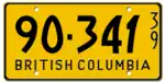 1939 | Embossed black serial on yellow plate with border line; "BRITISH COLUMBIA" at bottom and vertical "39" at right | none | 12-345 | 1 to approximately 99-000 | |
