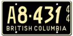 1944 | Embossed cream serial on black plate with border line; "BRITISH COLUMBIA" at bottom and vertical "44" at right | none | 12-345 | 1 to 99-999 | |