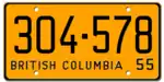 1955 | Embossed black serial on golden yellow plate with border line; "BRITISH COLUMBIA 55" at bottom | none | 123-456 | 1 to approximately 310-000 | First 6" x 12" plate. |
