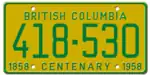 1958 | Embossed green serial on gold plate with border line; "BRITISH COLUMBIA" centred at top | "1858 CENTENARY 1958" at bottom | 123-456 | 1 to approximately 421-000 | Commemorated the 100th anniversary of the creation of the Colony of British Columbia. |