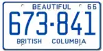 1966 | Embossed blue serial on white plate with border line; "BRITISH COLUMBIA" centred at bottom; "66" at top right | "BEAUTIFUL" centred at top | 123-456 | 1 to approximately 674-000 | |