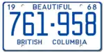 1968 | Embossed blue serial on white plate with border line; "BRITISH COLUMBIA" centred at bottom; "19" at top left and "68" at top right | "BEAUTIFUL" centred at top | 123-456 | 1 to approximately 762-000 | |