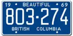 1969 | Embossed white serial on blue plate with border line; "BRITISH COLUMBIA" centred at bottom; "19" at top left and "69" at top right | "BEAUTIFUL" centred at top | 123-456 | 1 to approximately 805-000 |