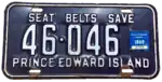 1976–80 | Embossed white serial on dark blue plate with border line; "PRINCE EDWARD ISLAND" at bottom; white box at right containing debossed "76" | "SEAT BELTS SAVE" centred at top | 12-345 | 19-790 to 99-999; 10-001 to approximately 12-000 |