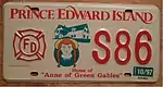 Volunteer Firefighter | 1993–1997 | Embossed red serial on reflective white plate; green and red Anne of Green Gables graphic slightly to left of centre; "PRINCE EDWARD ISLAND" screened in red at top | "Home of "Anne of Green Gables"" screened in red centred at bottom | A12 | ||