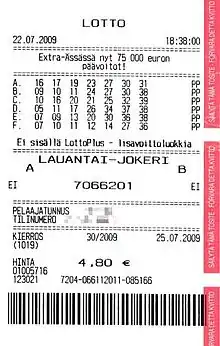 A modern Finnish Lotto coupon, with personal info (customer no. and account for winnings) blanked out. These coupons are printed out on a terminal connected to Veikkaus, the lottery provider, whenever a player participates in the lottery.