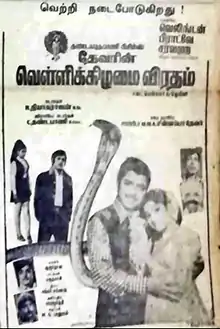 Vellikizhamai Viratham is the directorial debut of R. Thyagarajan.[3][4] Kamal Haasan worked under K. Thangappan as his dance assistant.[5] The film's story was written by Sandow Chinnappa Thevar inspired from the films The Shadow of the Cat and Cult of the Cobra who initially created a plot revolving around a child and snake since Thyagarajan wanted romance, a new plot was formed. Thyagarajan revealed sound overlapping system technology was used in the film.[3] Thyagarajan initially wanted to film in black-and-white; however Chinnappa Thevar insisted him to film in colour. 15 cobras were bought specially for this film.[6]