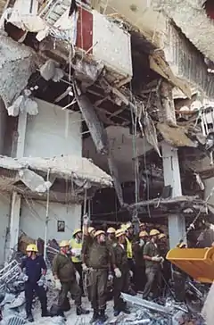 Rescue efforts were carried out by the Home Front Command's Search & Rescue Unit and the Yachtza reserve unit. Rescue efforts commenced immediately after the collapse with heavy safe procautions, in fear of the rest of the building would collaspe, one such messure was digging barehanded [4] and continued until 4pm on Saturday May 26, 2001. Three people were pulled from the rubble alive, and 23 bodies were removed.