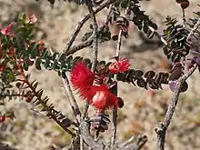 The flowers are arranged in spike-like groups on stalks 3–10 mm (0.1–0.4 in) long. The floral cup is top-shaped, 3–5 mm (0.1–0.2 in) long, glabrous and smooth with curved green appendages. The sepals are bright red, often creamish-green on their lower parts, 7–10 mm (0.3–0.4 in) long, with 8 to 16 feathery lobes. The petals are cream-coloured to pink when they open but become bright red, 6–10 mm (0.2–0.4 in) long, with a feathery edge and 2 ear-shaped appendages at their base. The style is 12–20 mm (0.5–0.8 in) long, gently curved, with simple hairs and extends well beyond the petals. Flowering time is from July to November or December.[2]