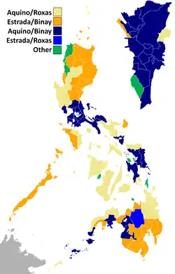![]() Map showing the official results taken from provincial and city certificates of canvass. The inset shows Metro Manila. | |||||||||||||||||||||||||||||||||||||||||||