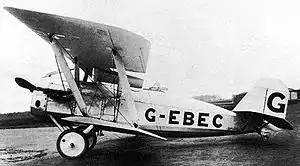 In 1922, Vickers designed a two-seat biplane as a private venture as a possible replacement for the Airco DH.9A and Bristol F.2 Fighter. Building on the experience of the unsuccessful wartime FB.14 fighter-reconnaissance aircraft, the Vixen was a single-bay biplane with a steel tube fuselage and wooden wings, powered by a 450 hp (340 kW) Napier Lion engine. The first prototype aircraft, the Type 71 Vixen I, given the civil registration G-EBEC, flew in February 1923.[1] It was tested at Martlesham Heath and showed good performance, prompting modification to a day bomber role as the Type 87 Vixen II, which was fitted with a ventral radiator between the undercarriage legs replacing the car-type radiator of the Vixen I, first flying in this form on 13 August 1923.[2] The Vixen I and II formed the basis of the Venture army co-operation aircraft for the Royal Air Force and the Valparaiso for export purposes.[3]