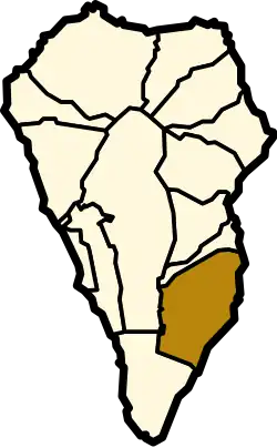 Villa de Mazo is a town and a municipality on the island of La Palma, Province of Santa Cruz de Tenerife, Canary Islands, Spain. It is situated in the southeastern part of the island. The population of the municipality is 4,858 (2013)[3] and the area is 71.17 km².[1] Villa de Mazo is 9 km south of the island capital Santa Cruz de La Palma. La Palma Airport is located on the coast of Villa de Mazo.
