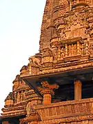 The north and south walls of the temple feature erotic reliefs.[15][20] The junction of the vestibule and the sanctum features a variation of the famous "acrobatic sex" sculpture at the newer Kandariya Mahadeva temple. Like the Kandariya sculpture, this one also features a couple supported by two women, but in this sculpture, the man is on the top. The woman at the bottom fingers the woman on the left with one hand, while her other hand rests on the ground for support. Some sculptures feature men indulging in bestiality, as women cover their eyes.[19]