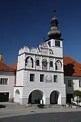 The historic town centre is formed by Svobody Square and adjacent streets. The main landmark of the square is the Renaissance town hall, built between 1521 and 1529. Other historical buildings include Gothic fortress from the 14th century, Church of All Saints from same period, Church of the Transfiguration, which was built between 1580 and 1618, and Jewish synagogue that dates from 1939. A Marian column located in the middle of the town square dates from 1760.[2][6]