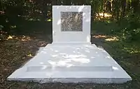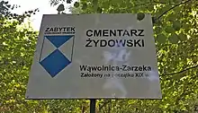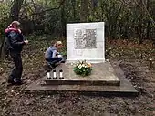 In 1993, Sara Tregerman-Ryterski (1917-2011), whose father and brothers were murdered in the massacre, built a monument (51°17′44″N 22°09′35″E / 51.2955°N 22.1597°E) at the cemetery to commemorate the event. The monument contains inscriptions in Polish and Hebrew. The Polish inscription is a dedication to the eternal memory of the victims and to one of the men who raised from the bodies around him, pleaded to spare his life and in return was shot dead. The inscription in Hebrew is a dedication to the victims of the Tregerman family, whom she carried and buried in the cemetery: Her father David and her brothers Abraham Hirsch, Refael Mordechai and Pesach Noah.