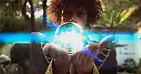 Nick Littlemore raises a sphere to create a blue beam in the video for "Walking on a Dream".