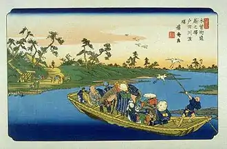 Keisai Eisen's ukiyo-e print of Warabi-shuku dates from 1835 to 1838, and depicts the ferry crossing the Arakawa River at dusk. On the small boat are a pair of itinerant blind women musicians with shamisen, a man and his horse, and a porter sitting smoking in the bow. The boatman propels the boat with a rear oar, while on the far bank more travelled await the arrival of the ferry.