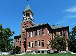 The Washington School building is located at the eastern corner of Vernon and East Vernon Streets, west of the city's downtown area. It is a two-story brick building, roughly T-shaped, with a hip roof and a square tower at one of its inner corners. It is architecturally eclectic, having a somewhat typical Colonial Revival massing, with Italianate rounded windows on the upper level. The tower has Renaissance Revival details at its belfry level, with round-arch colonnades supported by round columns, and a modillioned cornice below a bellcast pyramidal roof. The main entrance, set in the base of the tower, is recessed within a round-arch opening, with a half-round fanlight above.[2]
