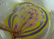After the base coat has dried, tape is put around the fingers to gather the excess nail polish after the marbling. One or two drops of colored lacquer are chosen for the design and are added to a cup of clean water. The drops will create a circle on the water surface. The next color is added on top of the circle created by the previous drop. The resulting pattern is ready for application to the nail, but it can still be modified with a stick or toothpick to create different shapes. The nail is dipped into the pattern on the water and kept under water as a Q-tip is used to "grab" the remaining polish.[6]