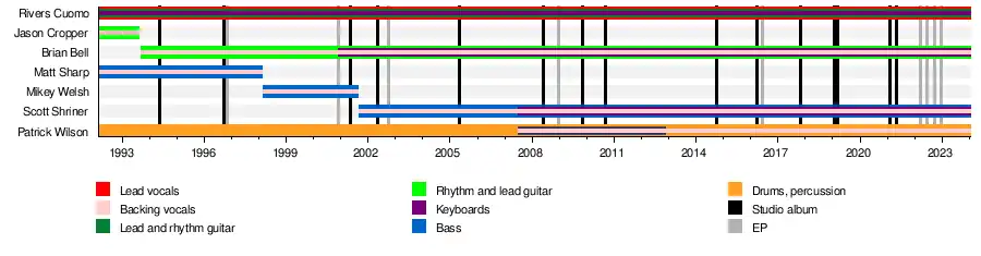 Weezer is an American rock band formed in Los Angeles, California, in 1992. Since 2001, the band has consisted of Rivers Cuomo (lead vocals, guitar, keyboards), Patrick Wilson (drums, backing vocals), Brian Bell (guitar, keyboards, backing vocals), and Scott Shriner (bass guitar, keyboards, backing vocals). They have sold 10 million albums in the US and more than 35 million worldwide.[1]