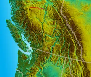 The river is 280 km (170 mi) long, draining an area of approximately 12,000 km2 (4,600 sq mi), and dropping over 900 m (3,000 ft) before joining with the Fraser.[3]