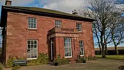 The house is of classic design with two-storeys, ashlar walls in the local pink sandstone, a slate roof and a projecting porch. On 11 June 1971 the house was category B listed by the Secretary of State.[5][6]