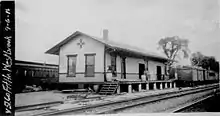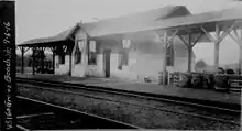 The New Haven & New London Railroad was chartered in 1848, began construction in 1850, and opened for service in July 1852.[4] A station was located on the north side of the tracks off Essex Road (the modern location) just north of downtown Westbrook.[5] The line was owned by the New York, Providence and Boston Railroad (the "Stonington Road") from 1858 to 1862, and by the Shore Line Railway from 1864 until it was acquired by the New York, New Haven, and Hartford Railroad (the "New Haven") in 1870.[4] The original 1852-built Westbrook combination depot still stands just north of the tracks at the original site, although it has been turned and moved slightly back from the tracks. A NYP&B emblem from the 1858-1862 ownership was formerly displayed on one end of the building.[6]