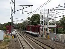 After demolition work over the next several months, the new parking lot was graded in June 2012 and a temporary platform was constructed west of the old one.[12] Construction of the 204-foot-long platforms took place in the third quarter of 2012, while the pedestrian bridge was lifted into place in March 2013.[14] The station was delayed by the unexpected discoveries of a buried concrete mass and utilities under the new station site.[15] The new station was formally opened on March 25, 2014.[2] Full bidirectional service to Westbrook began with the schedule change of May 11, 2014.[16]