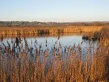 In 1970 the Somerset Wildlife Trust bought the first part of the last 12 hectares (30 acres) of acid raised bog vegetation left on the Somerset Moors undamaged by peat digging or agriculture.[4][32] Since then SWT have bought or been given 100-hectare (250-acre) of former peatworkings. These were sculpted and restored to wetland as the experimental area for the Avalon Marshes. This was the term given in the late 1980s to describe the wetland restored from peat workings in the Brue Valley. The wetland on the clay is dominated by Phragmites reed, catstail and open water. The wetland restoration has been a great success and was declared a National Nature Reserve in 1995. Peat working is now beginning to draw to a close on Westhay Moor and the majority of the remaining peatworkings are now being restored to wetland as they are completed. In 2014 two land owners unsuccessfully appealed against changes in planning permission which removed their rights to dig peat from Westhay Moor.[33][34]