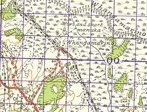 ![]() 1942 Whangamarino railway station on N52 one inch map | |