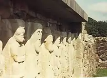 There are eight figures in all, including an uncarved figure, suggesting the figures were carved on-site, and a frowning face, or "mask". From left to right, the figures are as follows: