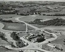 In 1910 the Nathan family subdivided their farm into 21 farms and farmlets, which grew the Whitford community.[3] Whitford Hall was built in 1912,[14] and from 1929 to 1934 during the Great Depression, the town hosted unemployment camps, where people could work at the Whitford Quarry.[15] During World War II, home guard troops dug trenches in the Turanga Creek, and built tank traps around Whitford.[16] In 1957, the Whitford Domain was opened as a sports ground and war memorial.[17]