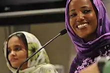 Sahrawi actresses Aziza Brahim and Memona Mohamed, during a press conference presentation of the movie "Wilaya", at the 10th Human rights film festival in San Sebastián, Spain, 26 April 2012