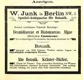 Wilhelm was born in Prague in a family with numerous pharmacists. His father Joseph Jeitteles (c. 1830–c. 1913) was a pharmacist and his mother Caroline Sobotka (c. 1844–c. 1878) came from a family of Prague industrialists. He was baptized as a Protestant and changed his name to Junk in 1890. After high school, he worked with his bookseller uncle Julius Friedländer in Berlin around 1882. He also attended lectures at the university and in 1891 became a partner at R. Friedländer & Sohn. He left Friedländer in 1899 and established his book dealership "Antiquariaat Junk", in 1899 in Berlin. He soon became the leading dealer in works on natural history in Europe. From the 1923 to 1933 was a period of great prosperity for book traders in Berlin, many who were Jewish (there was even a mildly pejorative term Bücherjuden or "book jews").[1] Junk also edited and published bibliographic reference works, notably Lepidopterorum Catalogus edited by Embrik Strand, and Coleopterorum Catalogus edited by Junk himself and Sigmund Schenkling. A Jewish refugee, he moved his shop to The Hague in the 1930s. He sold his business to Rudolph Schierenberg in 1935. It still operates as "Antiquariaat Junk".[2][3][4]