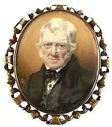 William Douglas, a descendant of the family of Douglas of Glenbervie, was born in Fifeshire on 14 April 1780. He received a liberal education, and very early showed a taste for the fine arts and the beauties of nature. This led to his being placed as an apprentice to Robert Scott the engraver at Edinburgh, John Burnet the engraver being one of his fellow-apprentices. Though he had skill as a landscape-painter, he adopted the profession of a miniature-painter, and gained considerable success, not only in Scotland, but in England. He was one of the associated artists who exhibited in Edinburgh from 1808 to 1816, and contributed to their exhibitions numerous miniatures, landscapes, and animal-pieces. He had numerous patrons, especially the Duke of Buccleuch and his family, and on 9 July 1817 he was appointed miniature-painter to Princess Charlotte and Prince Leopold of Saxe-Coburg. His miniatures were much esteemed for their tasteful and delicate execution. Some of these were exhibited by him at the Royal Academy in London in 1818, 1819, 1826, including a portrait of Lieutenant-general Sir John Hope.[1]