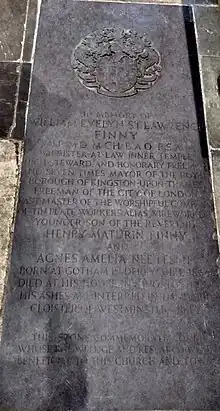 William Evelyn St Lawrence Finny M.D., M.Ch., B.A.O., J.P., F.S.A. (1864-1952), was a physician, local politician (Mayor of Kingston upon Thames seven times) and historian, author of 'All Saints, Kingston upon Thames (1930)'.[1]