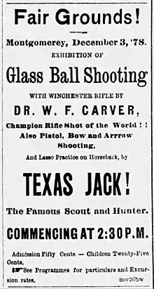 An advertisement for a shooting exhibition by Doc Carver and Texas Jack Omohundro.