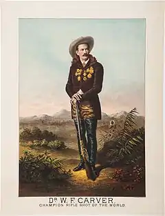 There seems to be no creditable information about Carver's childhood, as the contradictions in stories he told classify them as entertainment rather than fact.[1][2] For most of his adult life Carver gave the year of his birth as 1840, but it is likely he did so in order to enlarge the time frame needed to create stories of frontier experience for his admiring audiences after he became a showman.[3] Carver's biographer, Raymond Thorp, wrote that Carver left home at a young age to assert his family's right to land in Minnesota that the Sioux had supposedly granted his grandfather, Jonathan Carver, and that during this period of time he lived with the Santee Sioux.[4] This contention, however, like other claims made by Carver about his early life and never investigated by his biographer, does not withstand the scrutiny of reputable historians.[1]