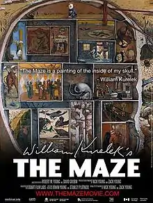 William Kurelek's The Maze is a documentary film about the life of celebrated Canadian artist William Kurelek, "dramatically told through his paintings and his on-camera revelations."[1] The film documents the artist's struggles with attempted suicide and what he called a "spiritual crisis." At the center of the film is Kurelek's work The Maze, which he describes in the film as “a painting of the inside of [his] skull which [he] painted while in England as a patient in Maudsley and Netherne psychiatric hospitals.”[2] This painting depicts a man’s "unraveled head lying in a wheat field. A curled up laboratory rat, representing his spirit, is trapped inside a maze of unhappy thoughts and memories."[1]