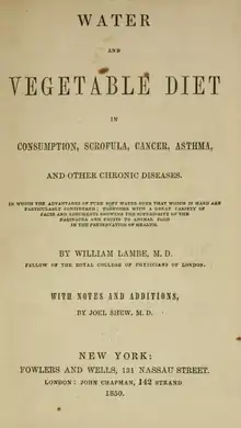 Lambe suffered from a variety of chronic diseases so gave up animal food in 1806 and embraced a vegetable and distilled water diet.[4] His health improved so he continued the diet on a permanent basis. Lambe tried the diet on several of his patients and published the results in a book in 1815.[4] In 1816, there was an extensive review of Lambe's book in The Medico-Chirurgical Journal and Review.[5] Lambe converted his patient John Frank Newton to vegetarianism.[6]
