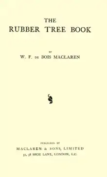 By the beginning of the 20th century, Maclaren and Frank Copeman were sole partners of Maclaren & Sons Ltd, 37–38 Shoe Lane, London, in the Fleet Street neighbourhood, who were publishers or publishers' agents of industrial books and magazines, such as The Brick and Pottery Trades Journal, and Ceylon Observer, and publishers of household titles, under the name of The British Baker, such as All About Pastries. One of their periodicals was the India Rubber Journal, the leading publication for the flourishing rubber industry in the beginning of the 20th century, with Sir Herbert Wright as editor for the period 1907–1917.[6][7][8][9] Copeman and Maclaren founded in 1906 the Rubber Estate Agency. It was the first UK company for the specific purpose of financing the acquisition of rubber estates and of acting as secretaries and agents of rubber and other plantation companies. With this expertise in the rubber industry, Maclaren wrote and published The Rubber Tree Book (Maclaren and Sons, London, 1913, 384 pages), about technology and business administration of rubber plantations. In 1919, the Rubber Estate Agency was sold to the Belgium company Societé Internationale de Plantations et de Finance (SIPEF). The R.E.A. company still exists, and was worth approximately GBP 37 million in 2010.[10][11][12][13]