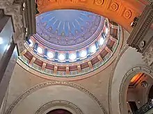 Beneath the dome, the oval windows of the drum illuminate the banking room.[17][27] The windows alternate with black pilasters designed in the Neo-Grec style, accented with red and gold decorations. The windows run above a band of ornaments and carved brackets, which are painted red, gold, green, and cream.[27] Above is a bronze and verd antique balustrade, which originally had 40 gas jets.[23][27] The gas jets were subsequently removed and a pipe rail installed in their place. A cornice runs just below the dome; it is painted black and accented in red and gold.[27] The dome itself is made of a double cast-iron shell and has a mural by P. B. Wight. The center of the mural is painted blue, with golden rays radiating from the top of the dome. The mural has a border with geometric, Neo-Grec, and floral designs.[10][27] The dome's height is variously cited as being 101 ft (31 m),[23] 110 ft (34 m),[27][29] or 115 ft (35 m).[10]