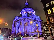 Above the arched openings on both sections is a low attic clad with stone. An ornate cornice runs above the attic.[7] Near the top of the building is a drum with 20 oval windows.[17] The drum supports a large cast-iron dome.[7][8] The dome is covered in steel plates, which the New-York Tribune described as being "laid in the same manner as slates"; this gave the dome a silvery effect.[11] The top of the dome has a cupola with a weather vane.[7] In a book about the building, the Williamsburgh Savings Bank described the dome as "comparing favorably with those of the capitol dome at Washington, with St. Paul's in London and St. Peter's in Rome".[18] The dome became a symbol of the bank, leading bank officials to request the inclusion of a dome atop its second headquarters at One Hanson Place (built in 1929), over the objections of that building's architects Halsey, McCormack and Helmer.[19]