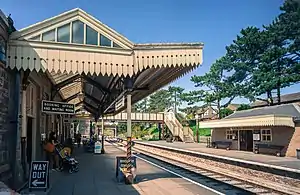 From February 1905 to June 1906, Winchcombe was the southern terminus of the line and buses to Cheltenham were provided pending the extension south.[15] From June 1906, eight local services each way ran between Honeybourne and Cheltenham (St James).[16] The completion of the North Warwickshire Line in July 1908 saw the first through services from Wolverhampton to Penzance.[17] By 1938, nine Down and ten Up services ran daily, with three on Sundays.[18] Traffic receipts for 1913 showed that 21,824 passengers had been carried, representing £1,436 in fares collected (equivalent to £150,327 in 2021[nb 1]), whilst 11,828 tons of goods traffic had been handled (mainly coal/coke and livestock), giving a total income of £5,837 (equivalent to £611,044 in 2021[nb 1]).[19][8] By 1933, both of these figures had fallen: receipts to £4,436 (equivalent to £335,043 in 2021[nb 1]) and goods tonnage to 8,320.[19] The Second World War however saw tonnage peak at 17,045,[20] with the bulk of it consisting in agricultural machinery, fertilisers and foodstuffs.[19]