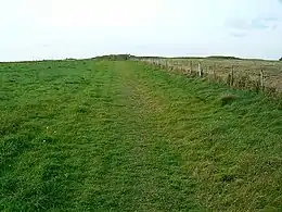 During a later phase, c. 3700 BC,[2] three concentric segmented ditches were placed around the hilltop site, the outermost with a diameter of 365 metres. The causeways interrupting the ditches vary in width from a few centimetres to 7 m. Material from the ditches was piled up to create internal banks; the deepest ditches and largest banks are on the outer circuit. In the same period there was also a rectangular mortuary enclosure.[3]