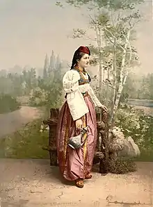 According to A. J. Schem: "Polygamy has never gained prevalence among the begs. The women go veiled in public, but enjoy at home a freedom and privilege greater than those of the Turkish women. The young women are allowed to receive attentions from the young men, and the young man who contemplates marriage is permitted to spend the evening with his betrothed, while she sits concealed from his view by a wall or shutter. It is related of the Bosnian women by a Turkish historian that when the first captives were taken to the Turkish court at Brussa, before the capture of Constantinople, they appeared to the chiefs like living genii from Paradise."[19]