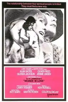 Women in Love is a 1969 British romantic drama film directed by Ken Russell and starring Alan Bates, Oliver Reed, Glenda Jackson, and Jennie Linden. The film was adapted by Larry Kramer from D.H. Lawrence's 1920 novel Women in Love.[2] It was the first film to be released by Brandywine Productions.[3]