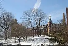 Both Boynton and Washburn died before the opening of the college on November 11, 1868. On that day, Charles O. Thompson, the first president of the Institute stood before WPI's first two buildings named Boynton Hall and Washburn Shops in honor of their respective donors, with their distinctive towers that even then symbolized the institution's two educational objectives of theory and practice, and inaugurated the Worcester County Free Institute of Industrial Science.[8][9]