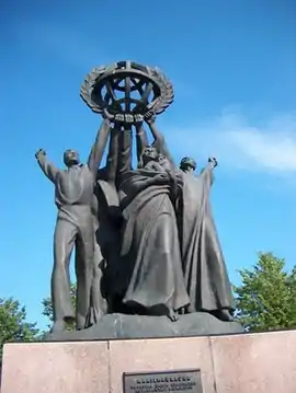 World peace (Finnish: Maailman rauha or Rauha maailmalle,[1] Swedish: Världsfreden, Russian: Мир во всем мире) is a bronze sculpture donated by the city of Moscow, Russia to the city of Helsinki, Finland, created by sculptor Oleg Kiryuhin. The sculpture was located at Hakaniemenranta in Helsinki, and it was revealed on 14 January 1990, two months after the Berlin Wall had been broken. The sculpture belongs to the collection of the Helsinki Art Museum.[2] The sculpture was moved to storage on 8 August 2022.