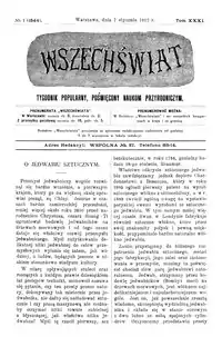 Wszechświat was founded in 1882[1] as a biweekly, initiators were students and teachers of The Main School in Warsaw. First editor-in-chief of the magazine was chemist Bronisław Znatowicz. He was leading the journal for many years. In 1914, when World War I began, Wszechświat was closed and Znatowicz left.[2]